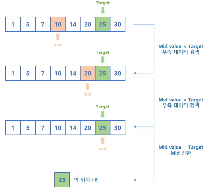 - 절반씩 검색하여 목표하는 값을 찾아나간다.